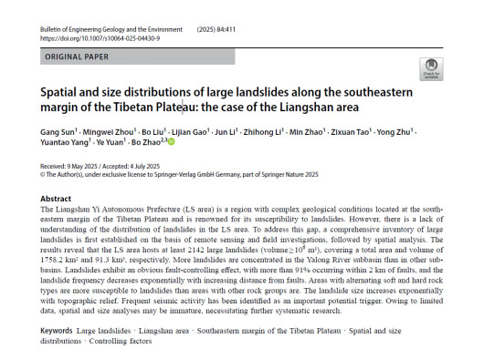 八大队成都分院孙刚高级工程师团队在施普林格(Springerlink)旗下的知名工程技术类期刊《Bulletin of Engineering Geology and the Environment》发表了研究论文《Spatial and size distributions of large landslides along the southeastern margin of the Tibetan Plateau: the case of the Liangshan area》,该成果主要由八大队孙刚、周明伟(通讯作者)、刘波(通讯作者)等与中国科学院水利部成都山地灾害与环境研究所赵波副研究员(通讯作者)合作完成。