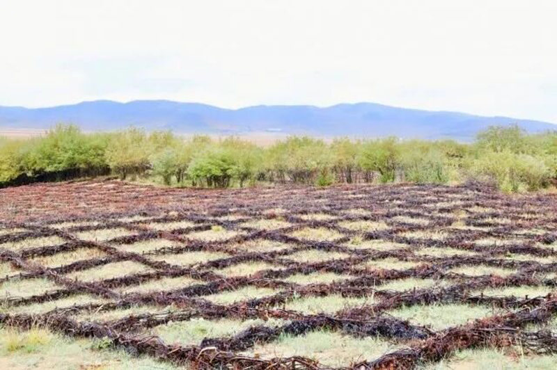 用高山柳制成草方格沙障以消减风力、防风固沙,促进植被恢复