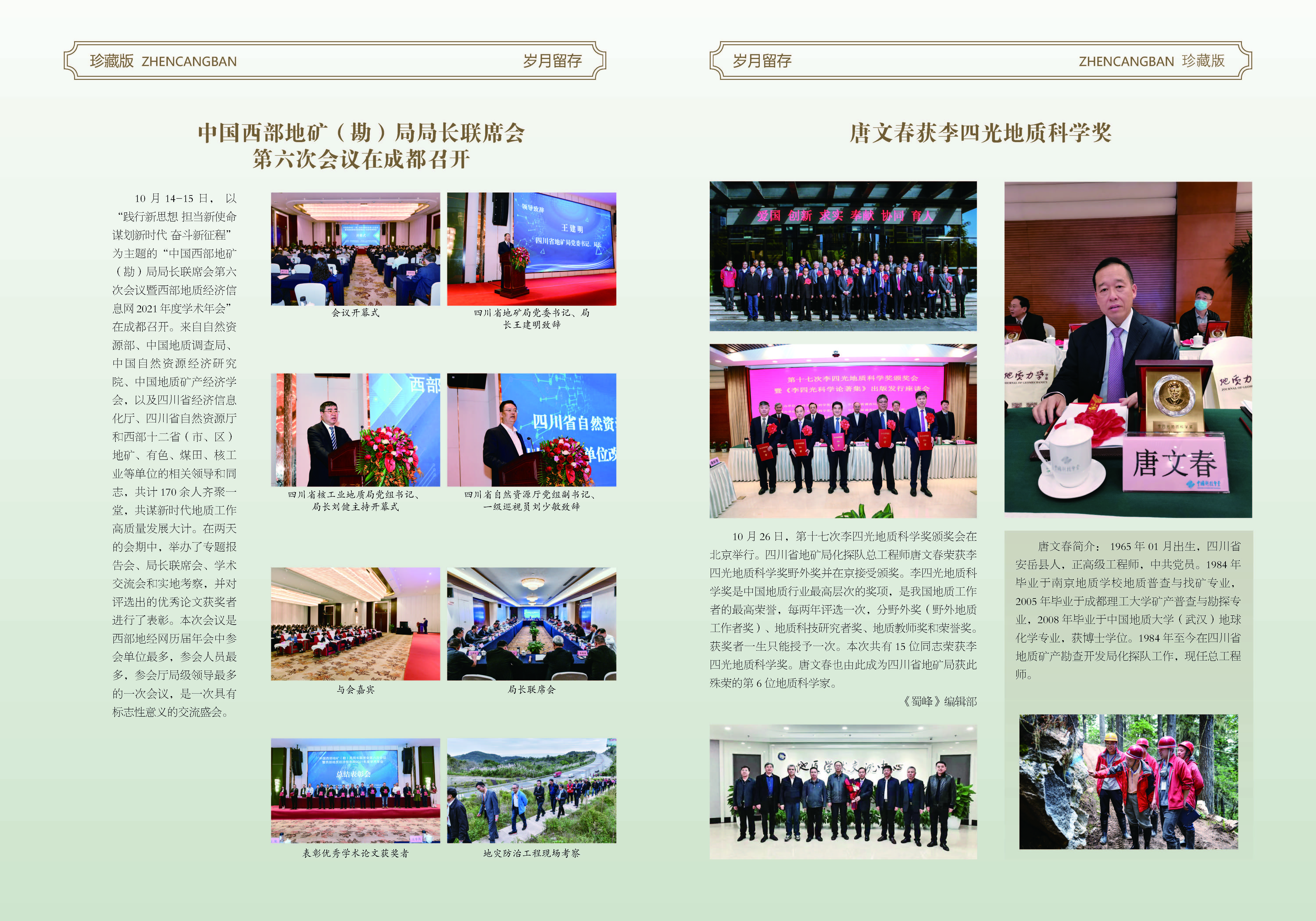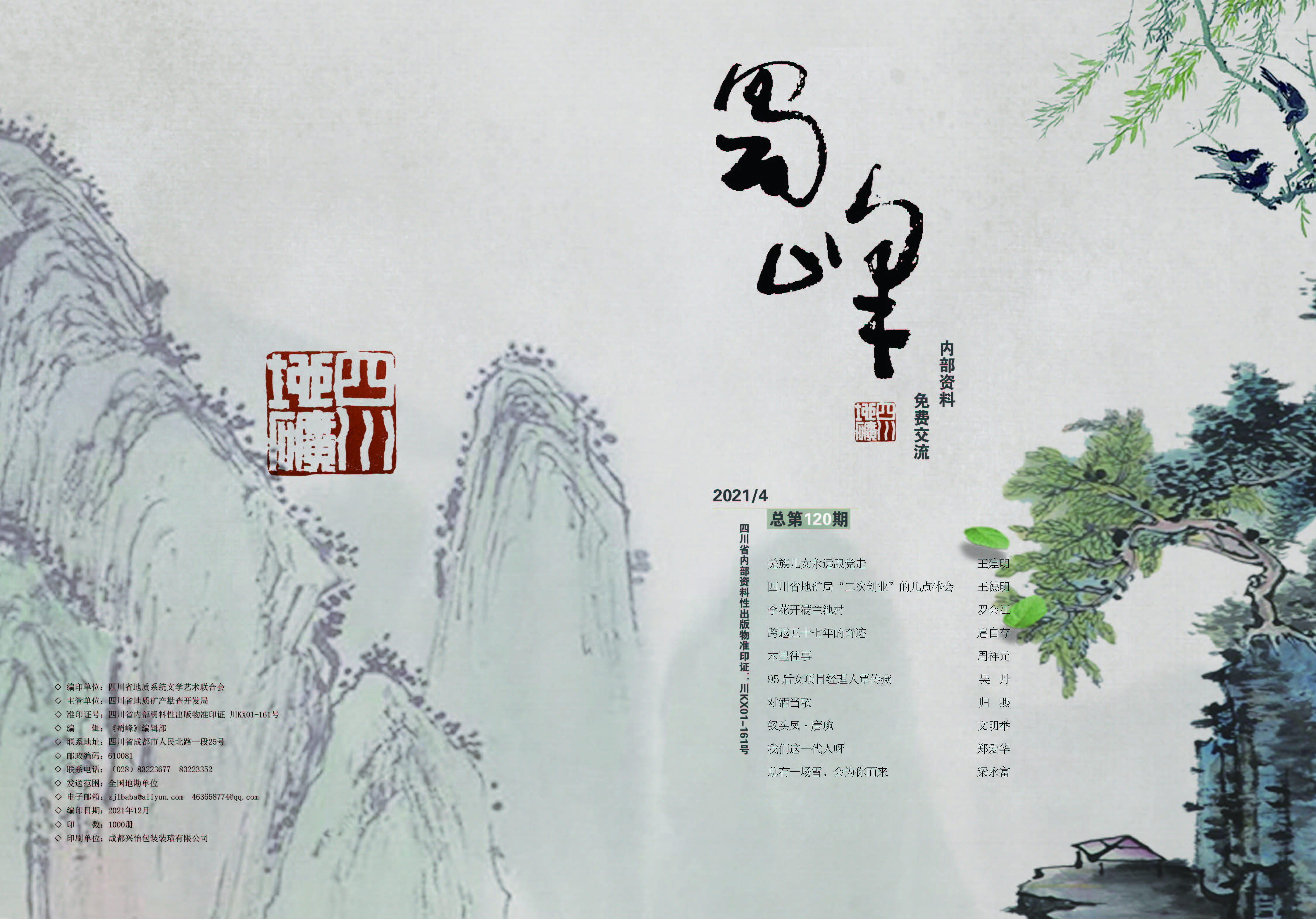 《蜀峰》是由四川省地矿局主办,经省新闻出版局批准的刊型内部资料(准印证号:川KX01-161号),是面向全省地质系统职工的一份文艺性内刊,以期在偏僻、艰苦的野外地质工作中,起到丰富职工精神生活、培养文艺爱好者和创作者、加强地质文化和自然资源文化建设的作用。自1987年创刊至今不间断出刊达35年,曾连续几年被省新闻出版局评为四川省优秀内刊,深受地质系统广大职工的关注和喜爱。