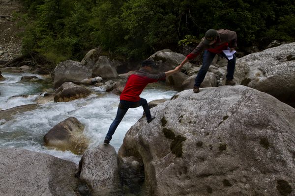 走在绿树庇荫、花繁叶茂的山路上,山顶树林中的流水在岩石间夺路而出,形成瀑布倾泻直下,轰鸣澎湃,水雾腾起,阳光绕过山巅射进峡谷,幻化着光影效果。仿佛在提醒你已身处,海拔仅2000多米的喜马拉雅南坡吉隆口岸。