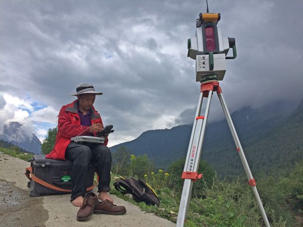 不顾坠入河中打湿衣衫,依然坚持釆集集光扫描数据