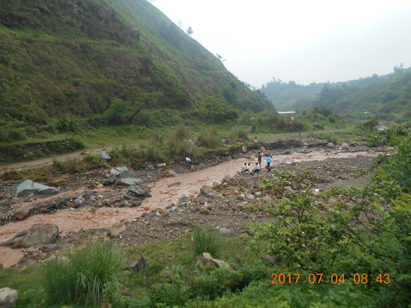 8点30分,当调查组赶到离滑坡现场2公里处,面临了新的难题,道路被冲毁,要想到达现场,只有徒步趟过水流湍急的拖船河。为了早点掌握第一手地灾资料,为了老百姓的安全,排查组成员没有过多的考虑,二话不说,脱掉雨鞋,手牵手趟过了湍急的拖船河,顾不得浑身湿透,继续急行,及时的到达了现场。